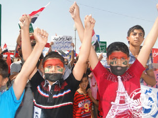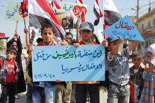 لما رايت الدمع في احداقها تبكي اباها بالتوجع والندم لو ان صدرا لامسته دموعها واحس حرقتها تفتت وانقسم ... ياقاتلا وأد الطفولة هل ترى قلب البراءة كيف يتم وانظلم من اجل ماذا تقتلون ضياءها ماذنبها فيمن تنحى او حكم ان قتل الاطفال في سوريا سياسة ممنهجة اعتمدت في مناطق عدة من سوريا ليصل عدد القتلى من اطفال سوريا الى الاف الاطفال حسب شبكة حقوق الانسان في سوريا منظمة هيومن رايس وتش الدولية لحقوق الانسان بشأن تقريرها الاخير ان هناك اطفال اعتقلتهم القوات السورية من منازلهم وعذبتهم وقتلت المئات منهم وحولت المدارس الى مراكز للاعتقال ومواقع للقناصة وسط هذه المعاناة لاطفال سوريا خرج المئات من اطفال العراق في تظاهرات منددة عمت وسط وجنوب العراق بعد ان سكت الكبار ممن يحملون عناوين ورموز دينية بالاضافة الى سكوت الكثير الموسسات الدينية والحقوقية ![]() ![]() ![]() ![]() ![]() ![]() الاطفال رفعوا شعارات اوقفوا قتل الاطفال في سوريا اين منظمات اليونسيف والامم المتحدة من جرائم بشار الاسد كلا كلا لصمت الحكام والمسؤولين والرموز والخطباء ازاء قتل الاطفال في سوريا وفي نهاية وقفتهم مع اطفال الشعب السوري وجهوا رسالة الى المجمتع الدولي بالكف عن السكوت ازاء جراء الاسد والوقوف مع الشعب السوري في محنته ومعاناته كي يعيش بسلام وامان كباقي البلدان |